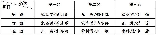 首先登场的A组男双蒙树勇/贾锦彪对阵钱红安/曹周员,刚一上场两对球员便掀起了激烈厮杀,双方在短兵相接中进行快速的攻防转换,紧紧抓住对方稍纵即逝的漏洞为自己争取主动,蒙/贾组合通过更加细腻的控网手法31:23拿下首场;第二场比赛在白万晓/党杰和张渭民/成定荣之间展开,党教练球风儒雅鲜有杀球,不轻易挑球给对方制造机会,也不轻易杀球这招显然给己方带来太大被动,搭档白主席也成为对手的靶子,27:31难敌对手;紧接着白/党组合迎战劲敌蒙/贾组合,也许感觉自己处于劣势,党教练改变了策略,以点杀、劈吊使对方不得不疲于防守,对手送过来的不高不远的回球恰恰给了自己截杀的机会,一次次地瓦解对手的攻势之后,他们很快将优势转化为胜势,31:21制造出了惊喜;男双冠亚军决赛,A组排名第二的钱红安/曹周员挑战B组排名第一的王爽/郭子凯,这是校队的第一、第二男双,这个名次正是他们场下切磋胜负的写照,谁的发挥技高一筹充满悬念,以防守见长的王/郭组合依然沿用老式套路,在对手连续狙击的进攻中毫无启迪,未能走出固执的泥潭,给对手留下有利时机,比分被反超之后便失去了斗志,钱/曹组合则乘胜追击,31:21无情碾压,打破了训练赢比赛输的魔咒,脸上绽放出冠军应有的灿烂笑容。