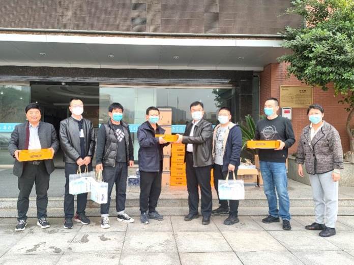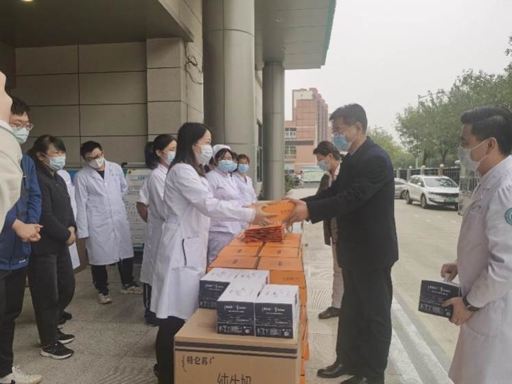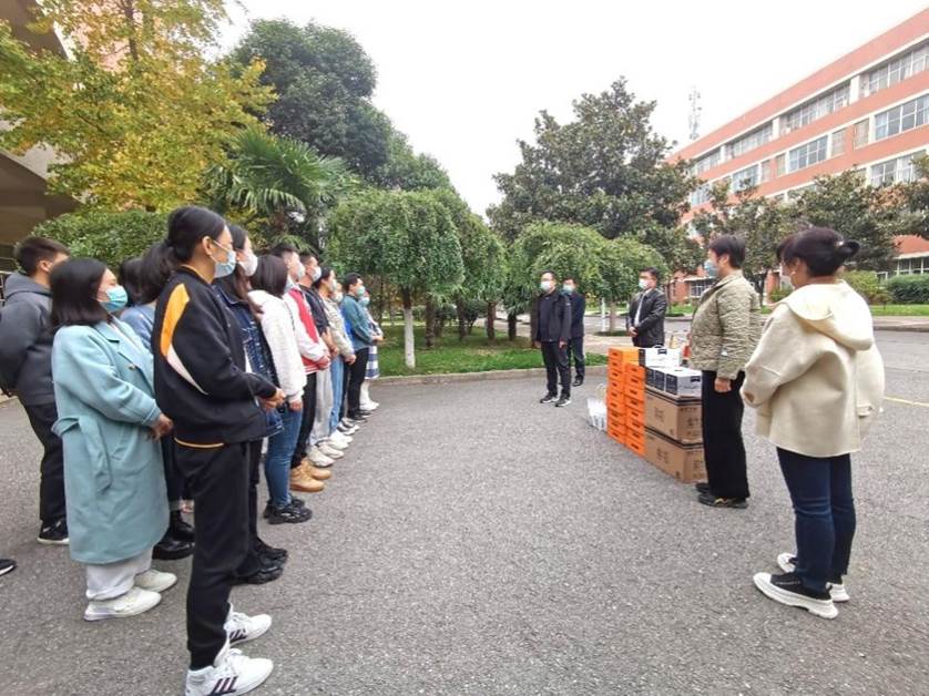 巩守平在行政楼前为党政办公室、后勤保障处、保卫处等职能部门职工发放慰问品,他赞扬了特殊时期大家在师生生活保障、校园安全稳定、环境卫生消杀等方面所做的大量工作。