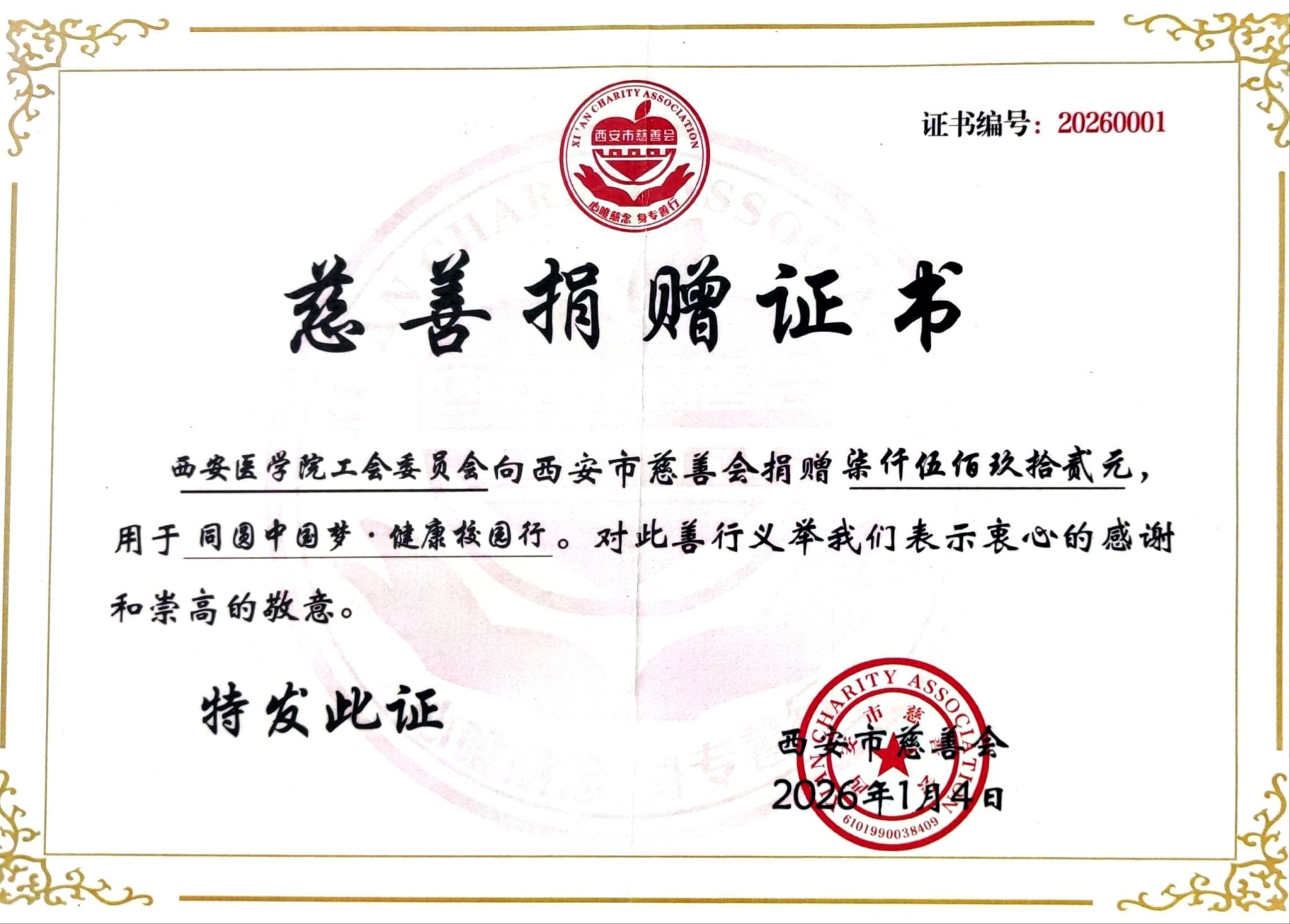 近日,西安市慈善会向校工会发来捐赠证书和票据,对我校教职工热心公益、无私奉献的善举致以感谢。